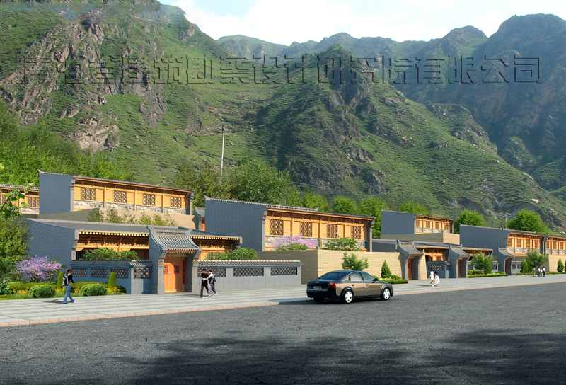 建筑窗框、檐口檀條、椽條等顏色涂成仿木色,強(qiáng)調(diào)傳統(tǒng)民居的木結(jié)構(gòu)特色。